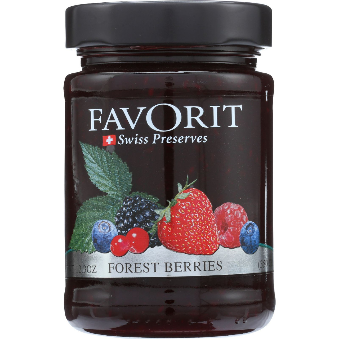 Enjoy Favorit Swiss Forest Berries Preserves . Favorit Natural Swiss Preserves Feature Jams Prepared With 52% Fruit. Favorit Is The Number One Selling Brand Of Jams In Switzerland. The Selection Of 9 Fruit Creations Include: Strawberry, Raspberry, Forest Berry, Apricot, Red Cherry, Strawberry & Rhubarb, Peach & Mango, Blueberry And Bitter Orange. Imported From Switzerland, Favorit Preserves Contain No Artificial Preservatives, Color Or Flavor. Favorit Is Made Of Real Chunky Fruit Bits, Not Just Fruit Pulp Or Fruit Flavored Jelly. The Unique Packaging And Great Taste Are An Unbeatable Combination. (Note: Description is informational only. Please refer to ingredients label on product prior to use and address any health questions to your Health Professional prior to use.