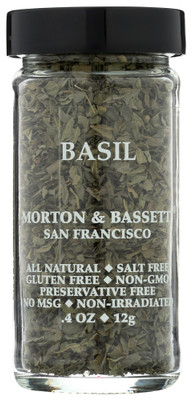 All natural; Salt free; No MSG; No preservatives; Non-Irradiated; Kosher. A versatile herb commonly found in Italian and French recipes. Basil has a natural affinity for egg and seafood dishes or pasta sauces. Try a teaspoon on summer vegetables, salads, and cooked squash to enliven flavor. Exceptional in tomato dishes or with cheese and olive oil.